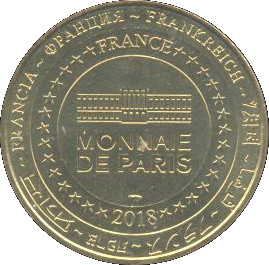 Описание: На периферії слово «Франція» написано вісьмома мовами. Франція на 12-й годині, 2018 рік на 6-й годині, все з'єднано 14 зірками праворуч і ліворуч. У центрі — будівля Монетного двору Парижа.