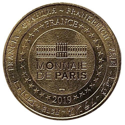 Описание: На периферії слово «Франція» написано вісьмома мовами. Франція на 12-й годині, 2019 рік на 6-й годині, все пов'язане 14 зірками праворуч і ліворуч. У центрі — будівля Моне де Парі.