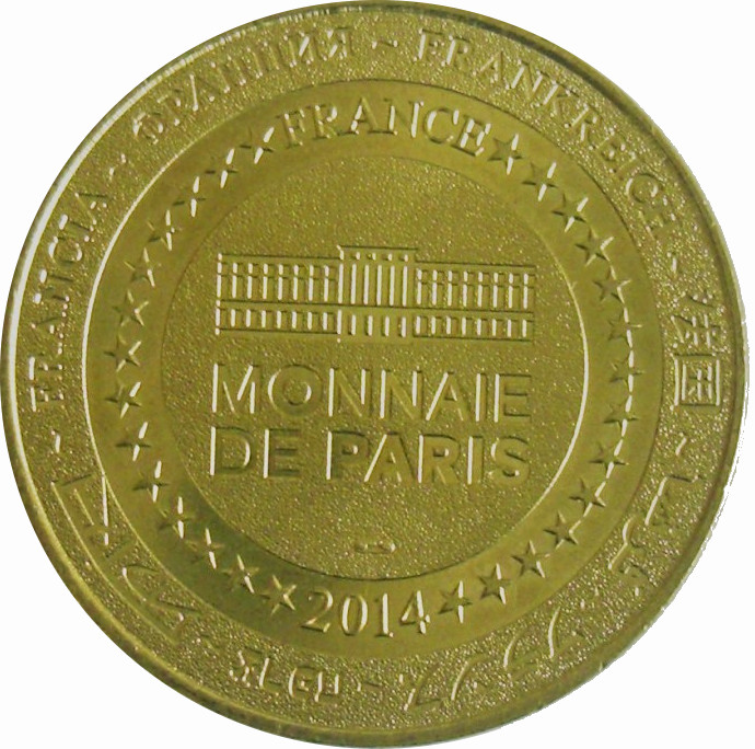 Описание: На периферії слово «Франція» написано вісьмома мовами. Франція на 12-й годині, 2014 рік на 6-й годині, все пов'язане 14 зірками праворуч і ліворуч. У центрі — будівля Моне де Парі.