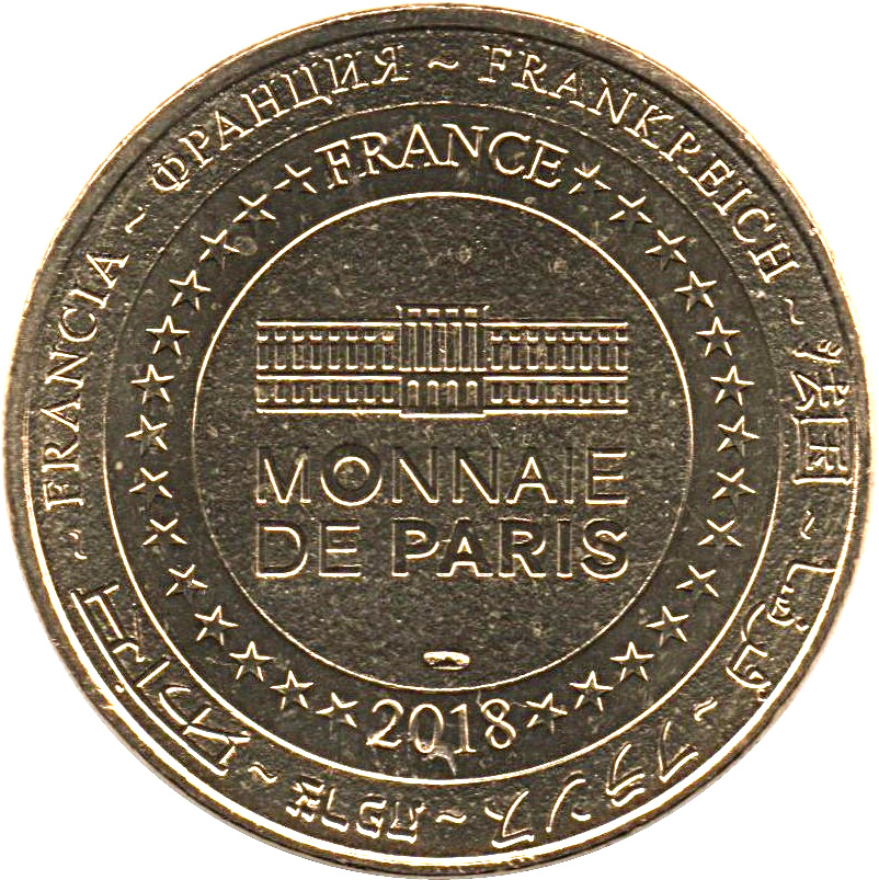Описание: На периферії слово «Франція» написано вісьмома мовами. Франція на 12-й годині, 2018 рік на 6-й годині, все пов'язане 14 зірками праворуч і ліворуч. У центрі — будівля Моне-де-Парі.