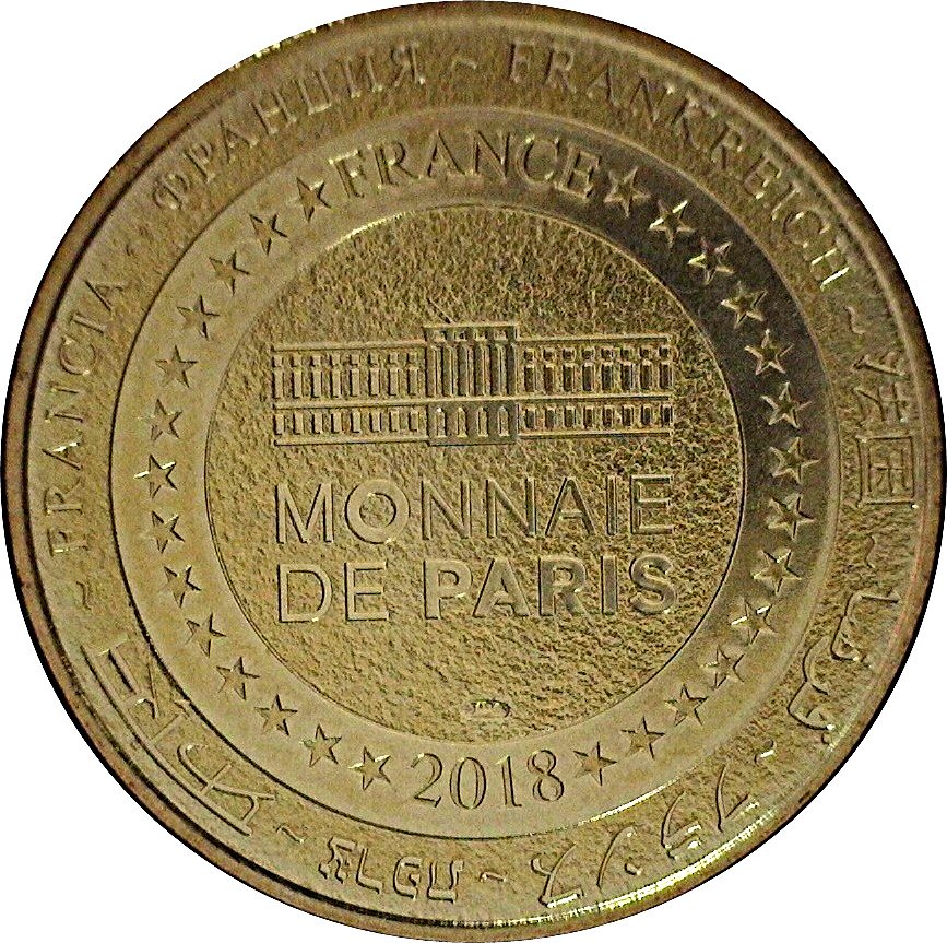 Описание: На периферії слово «Франція» написано вісьмома мовами. Франція на 12-й годині, 2018 рік на 6-й годині, все пов'язане 14 зірками праворуч і ліворуч. У центрі — будівля Моне-де-Парі.