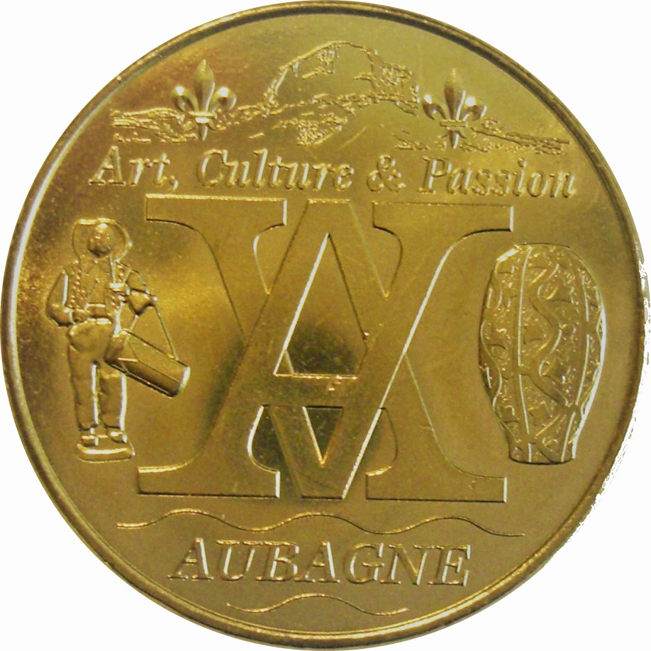 Описание: 2 Посередині, переплетені, одна монета стоїть прямо, інша — догори дном. По обидва боки — сантон і керамічний горщик. Обань, французька комуна департаменту Буш-дю-Рон, регіон Прованс-Альпи-Лазурний Берег.