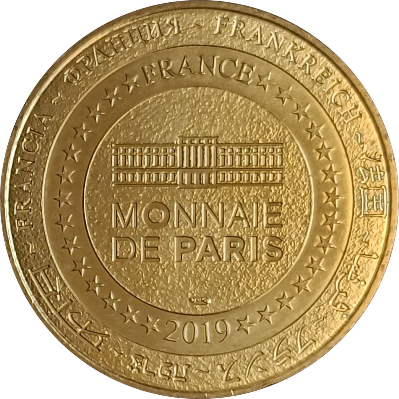 Описание: На периферії слово «Франція» написано вісьмома мовами. Франція на 12-й годині, 2019 рік на 6-й годині, все пов'язано 14 зірками праворуч і ліворуч. У центрі в колі — будівля Моне де Парі.