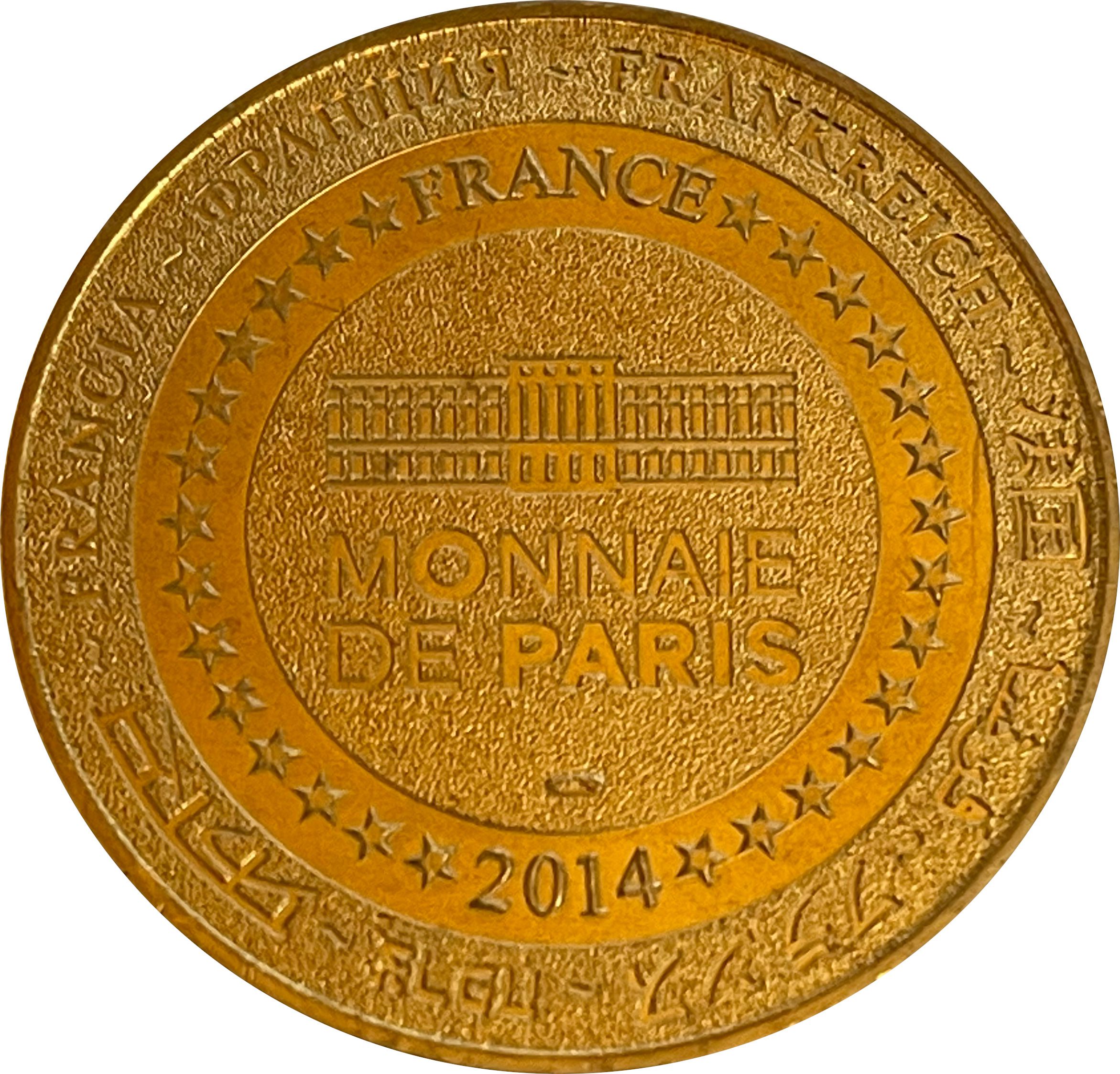 Описание: На периферії слово «Франція» написано вісьмома мовами. Франція на 12-й годині, 2014 рік на 6-й годині, все пов'язане 14 зірками праворуч і ліворуч. У центрі — будівля Паризького монетного двору.