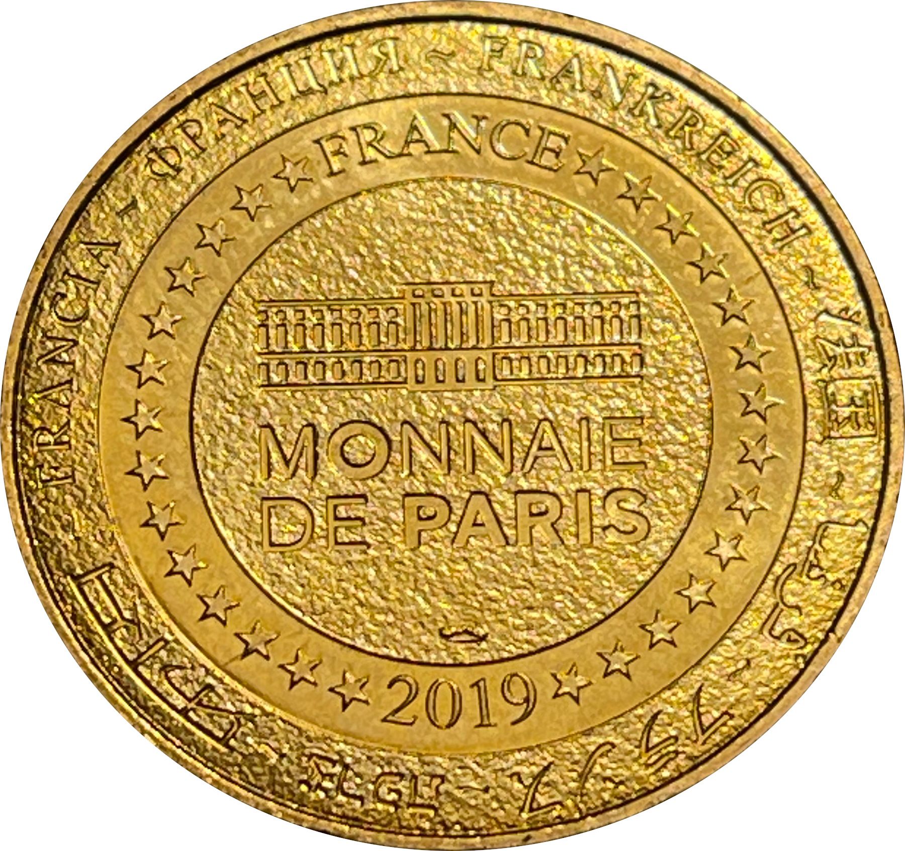 Описание: На периферії слово «Франція» написано вісьмома мовами. Франція на 12-й годині, 2019 рік на 6-й годині, все пов'язане 14 зірками праворуч і ліворуч. У центрі — будівля Моне де Парі.