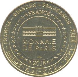 Описание: На периферії слово «Франція» написано вісьмома мовами. Франція на 12-й годині, 2018 рік на 6-й годині, все пов'язане 14 зірками праворуч і ліворуч. У центрі — будівля Моне-де-Парі.