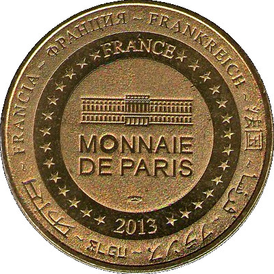 Описание: На периферії слово «Франція» написано вісьмома мовами. Франція на 12-й годині, 2013 рік на 6-й годині, все пов'язане 14 зірками праворуч і ліворуч. У центрі — будівля Монетного двору Парижа.