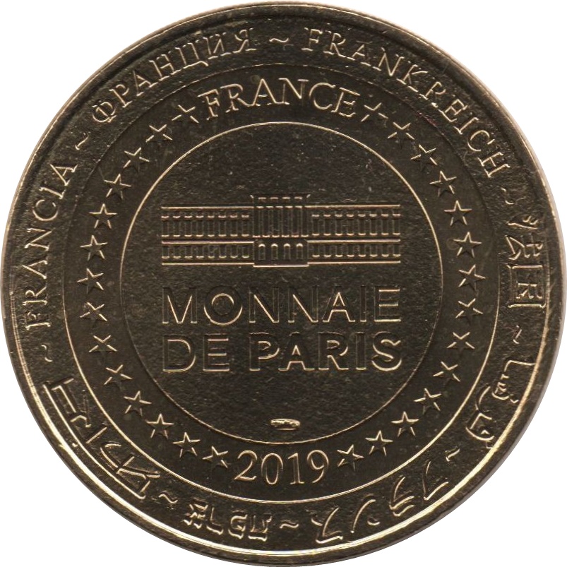 Описание: На периферії слово «Франція» написано вісьмома мовами. Франція на 12-й годині, 2019 рік на 6-й годині, все пов'язане 14 зірками праворуч і ліворуч. У центрі — будівля Моне де Парі.