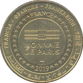 Описание: На периферії слово «Франція» написано вісьмома мовами. Франція на 12-й годині, 2019 рік на 6-й годині, все пов'язане 14 зірками праворуч і ліворуч. У центрі — будівля Моне де Парі.
