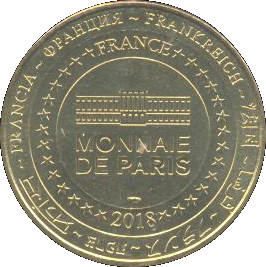 Описание: На периферії слово «Франція» написано вісьмома мовами. Франція на 12-й годині, 2018 рік на 6-й годині, все пов'язане 14 зірками праворуч і ліворуч. У центрі — будівля Моне-де-Парі.