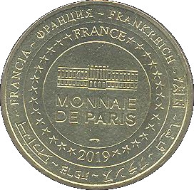 Описание: На периферії слово «Франція» написано вісьмома мовами. Франція на 12-й годині, 2019 рік на 6-й годині, все пов'язане 14 зірками праворуч і ліворуч. У центрі — будівля Монетного двору Парижа.