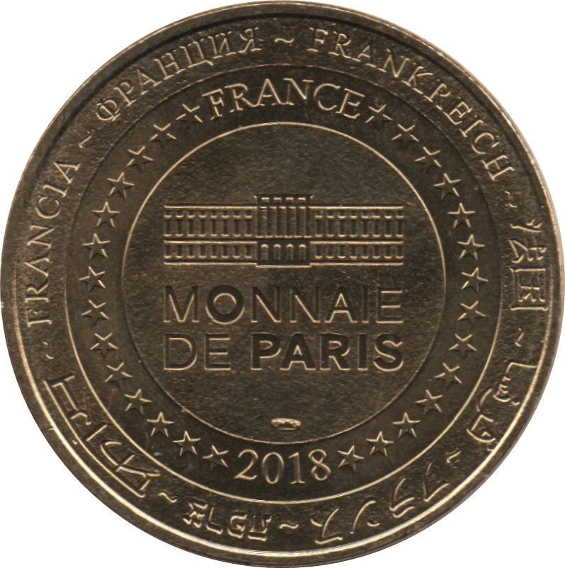 Описание: На периферії слово «Франція» написано вісьмома мовами. Франція на 12-й годині, 2018 рік на 6-й годині, все пов'язане 14 зірками праворуч і ліворуч. У центрі — будівля Моне-де-Парі.