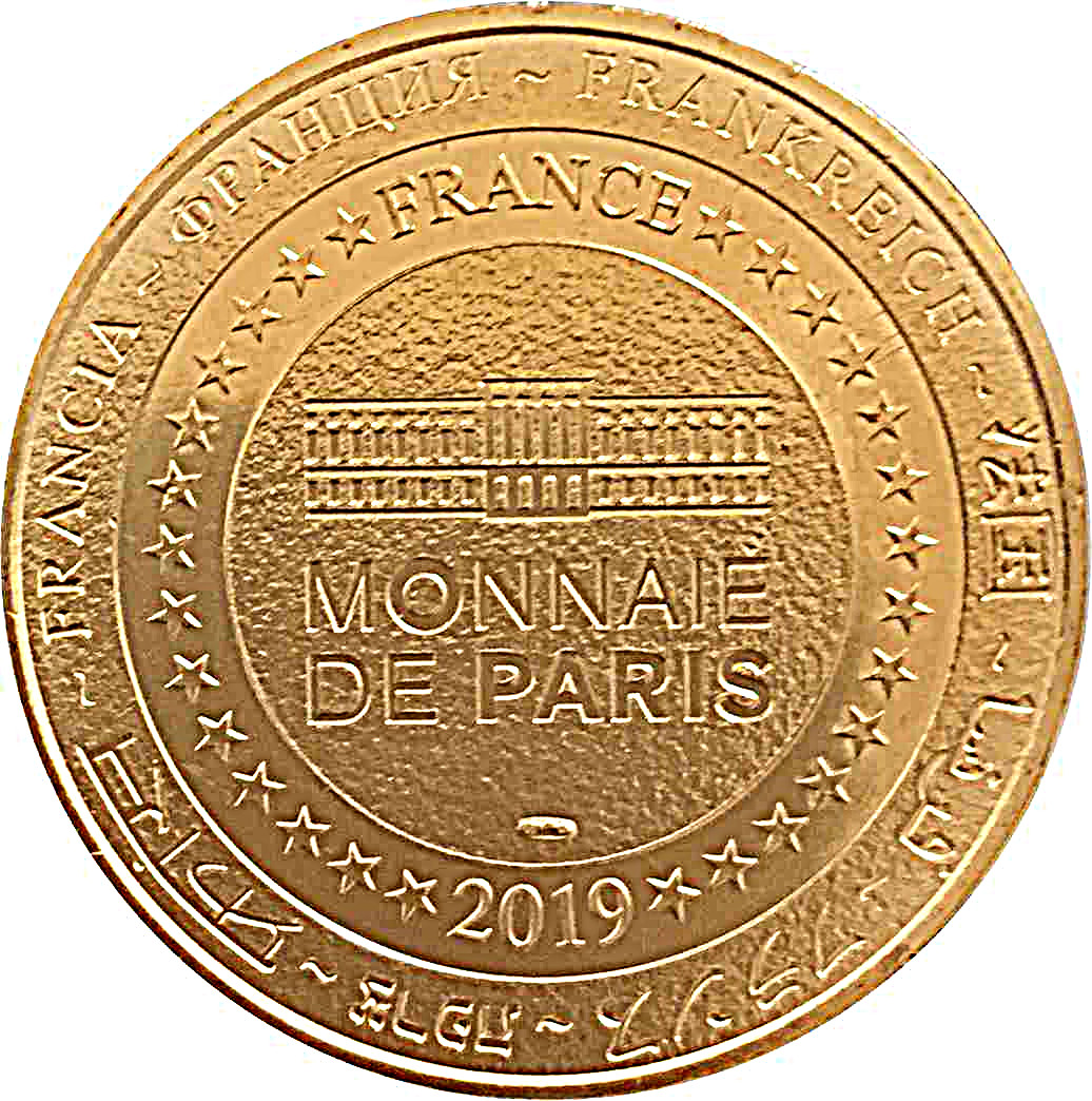 Описание: На периферії слово «Франція» написано вісьмома мовами. Франція на 12-й годині, 2019 рік на 6-й годині, все пов'язане 14 зірками праворуч і ліворуч. У центрі — будівля Монетного двору Парижа.