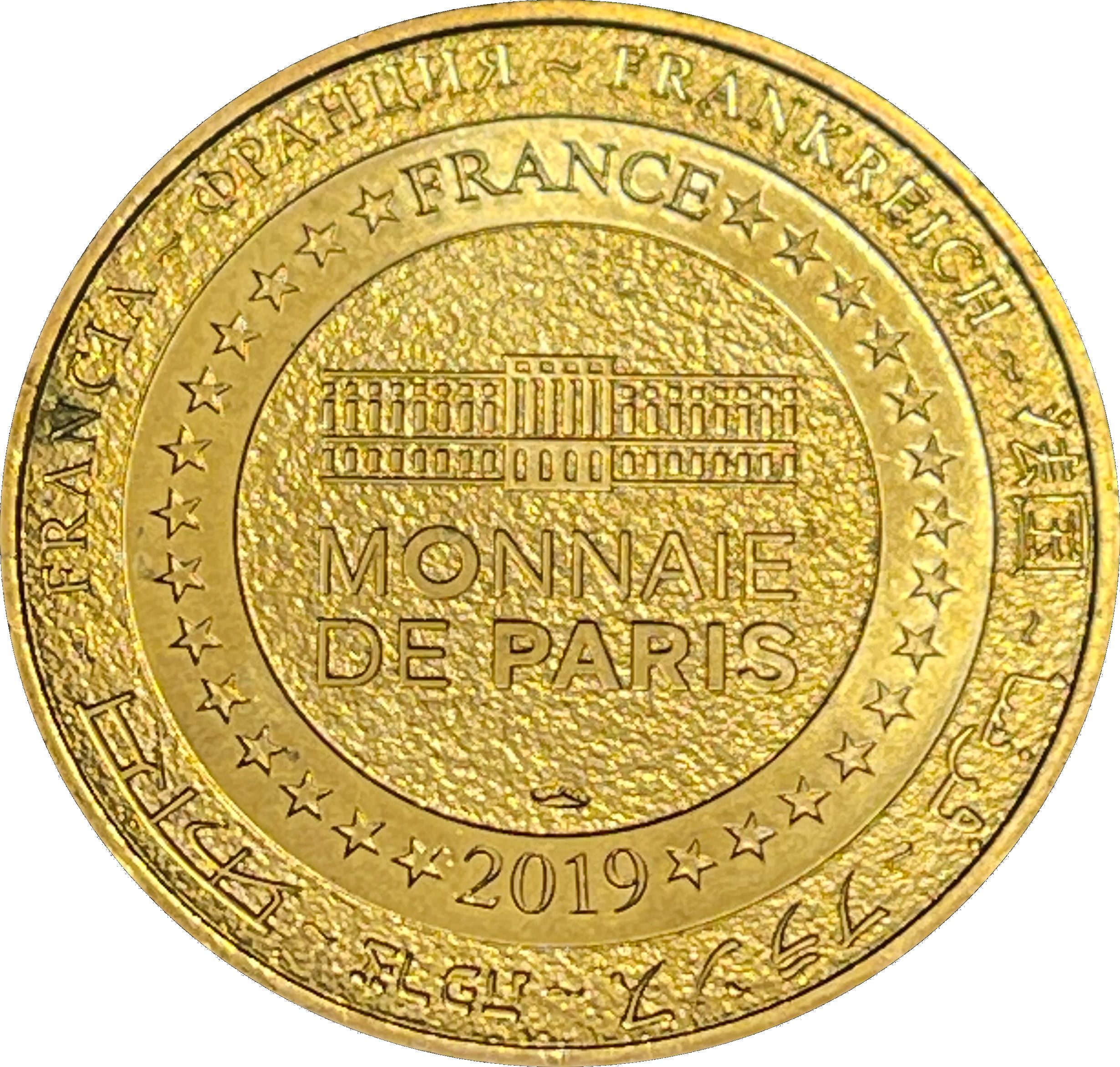 Описание: На периферії слово «Франція» написано вісьмома мовами. Франція на 12-й годині, 2019 рік на 6-й годині, все пов'язане 14 зірками праворуч і ліворуч. У центрі — будівля Моне-де-Парі.