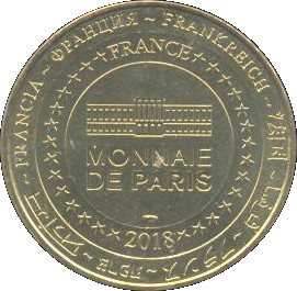 Описание: На периферії слово «Франція» написано вісьмома мовами. Франція на 12-й годині, 2018 рік на 6-й годині, все пов'язане 14 зірками праворуч і ліворуч. У центрі — будівля Моне-де-Парі.