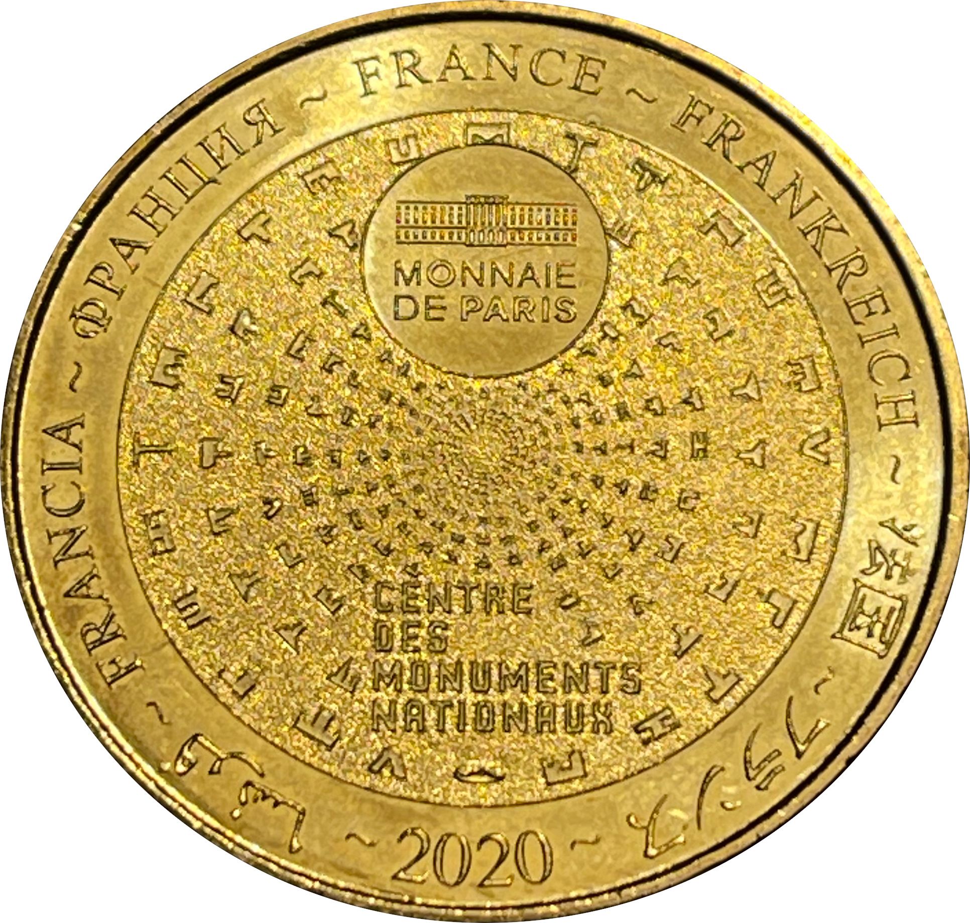 Описание: На периферії слово «Франція» написано сімома мовами. У положенні «12 годин» зображено будівлю Monnaie de Paris у колі. Піктограми Centre des Monuments Nationaux сходяться в центрі.