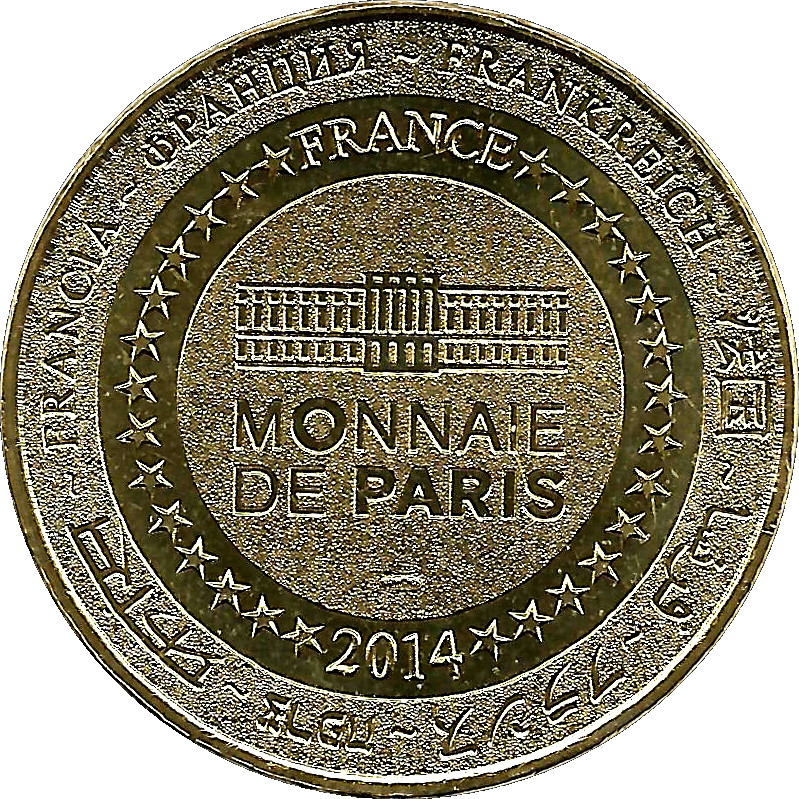 Описание: На периферії слово «Франція» написано вісьмома мовами. Франція на 12-й годині, 2014 рік на 6-й годині, все пов'язане 14 зірками праворуч і ліворуч. У центрі — будівля Monnaie de Paris.