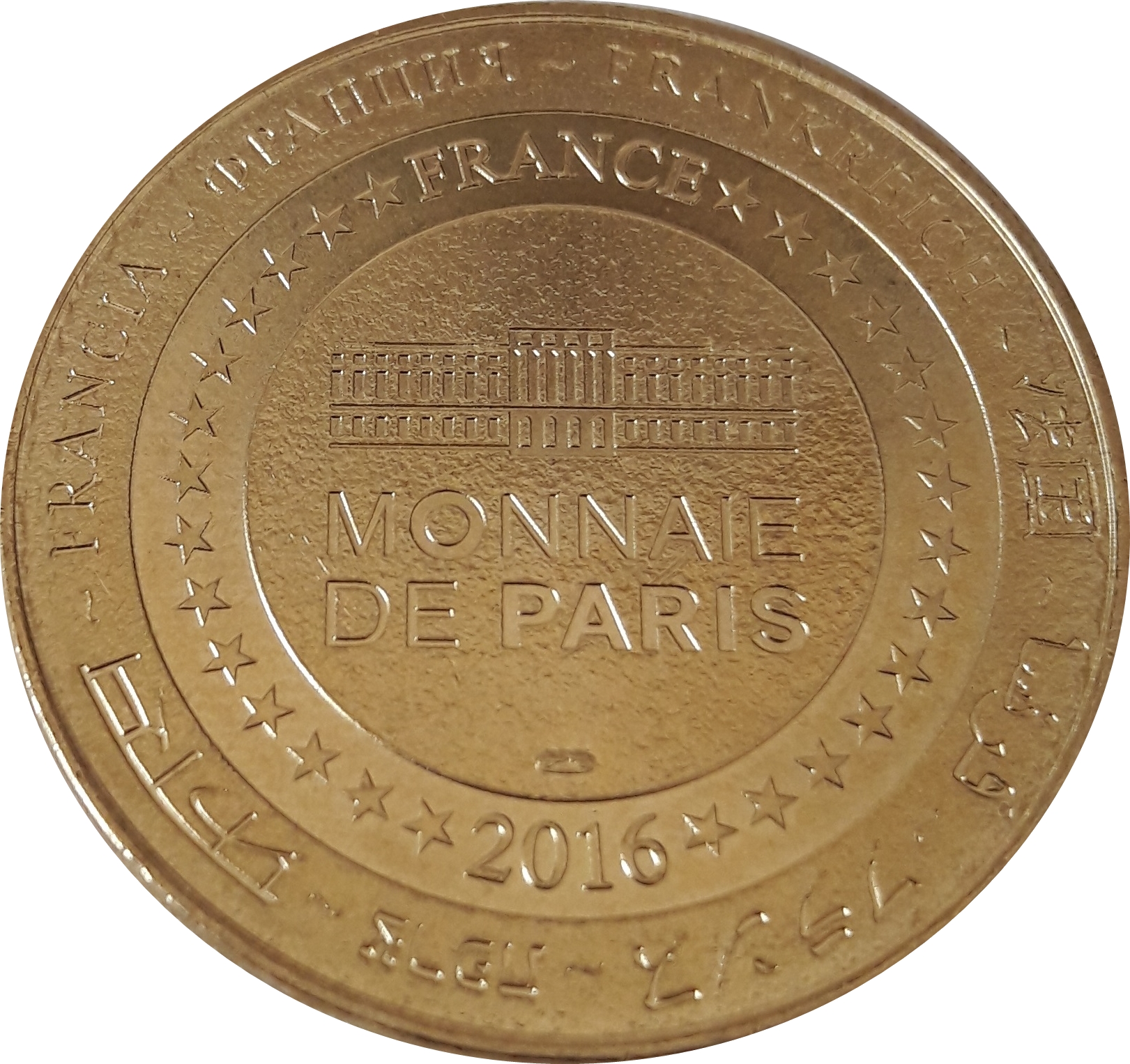 Описание: На периферії слово «Франція» написано вісьмома мовами. Франція на 12-й годині, 2015 рік на 6-й годині, все пов'язане 14 зірками праворуч і ліворуч. У центрі — будівля Моне-де-Парі.