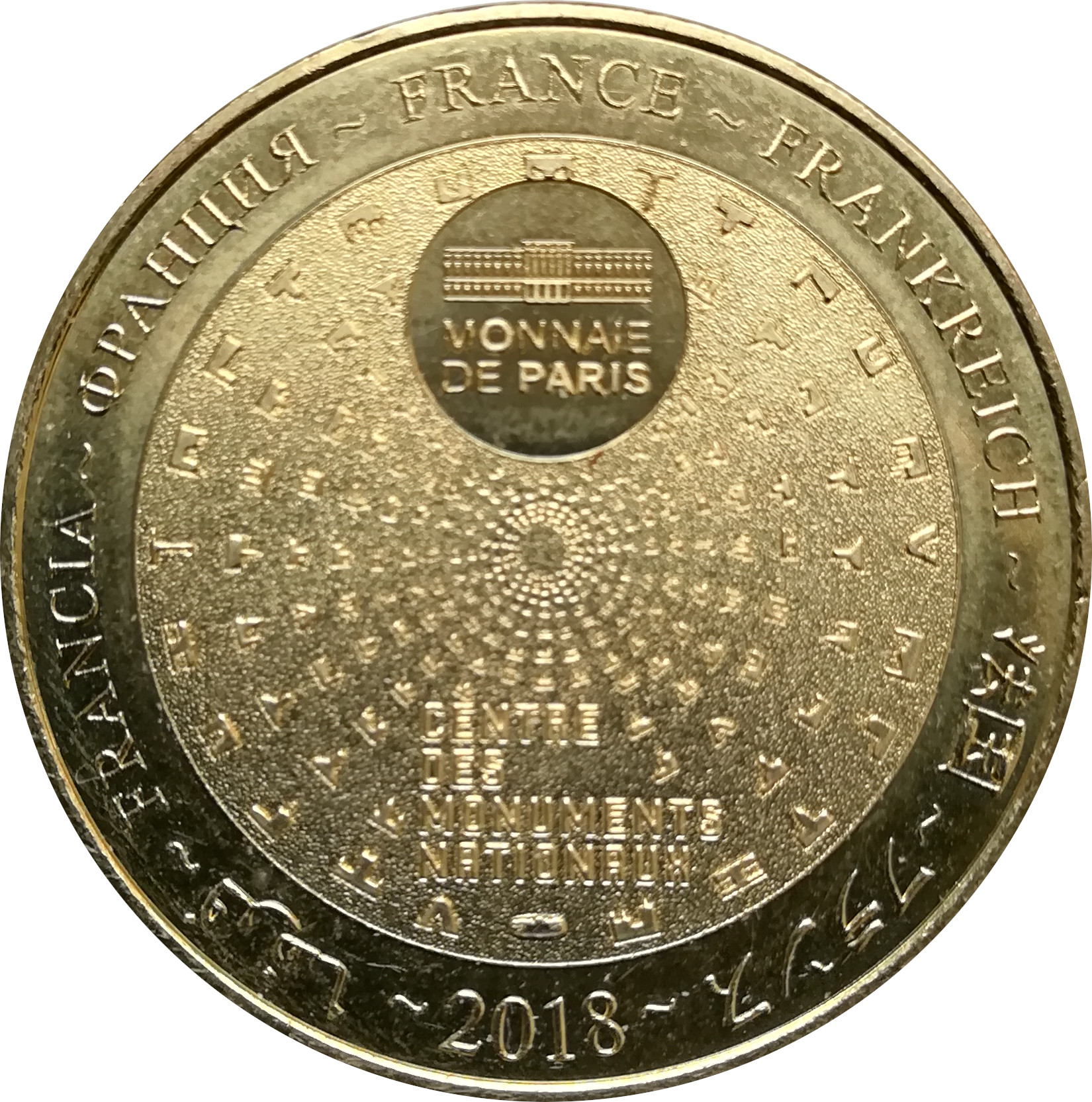 Описание: На периферії слово «Франція» написано сімома мовами. У положенні «12 годин» зображено будівлю Monnaie de Paris у колі. Піктограми Centre des Monuments Nationaux сходяться в центрі.