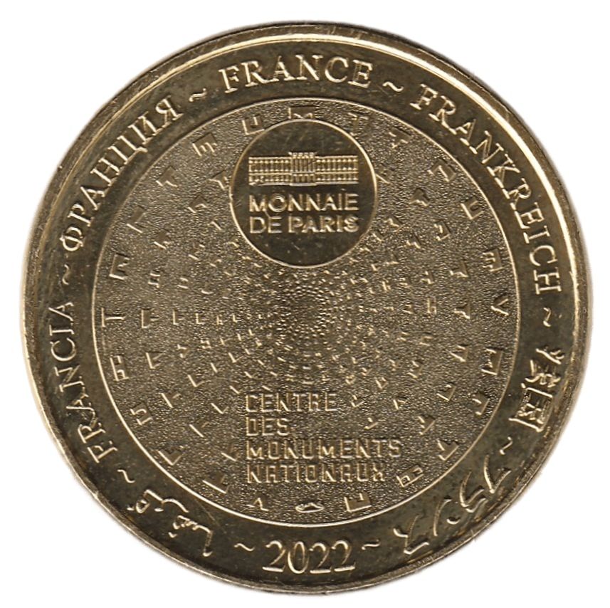 Описание: Французький текст сімома мовами по периферії. Символ Monnaie de Paris на 12-й годині. Різні піктограми Centre des Monuments Nationaux, що сходяться в центрі.