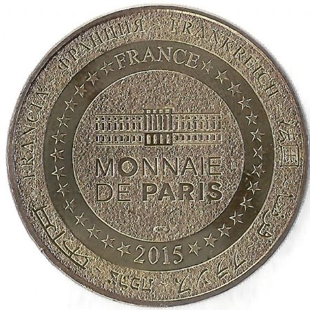Описание: На периферії слово «Франція» написано вісьмома мовами. Франція на 12-й годині, 2015 рік на 6-й годині, все пов'язане 14 зірками праворуч і ліворуч. У центрі — будівля Моне-де-Парі.