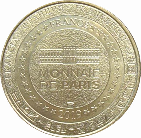 Описание: На периферії слово «Франція» написано вісьмома мовами. Франція на 12-й годині, 2019 рік на 6-й годині, все пов'язане 14 зірками праворуч і ліворуч. У центрі — будівля Паризького валютного банку.
