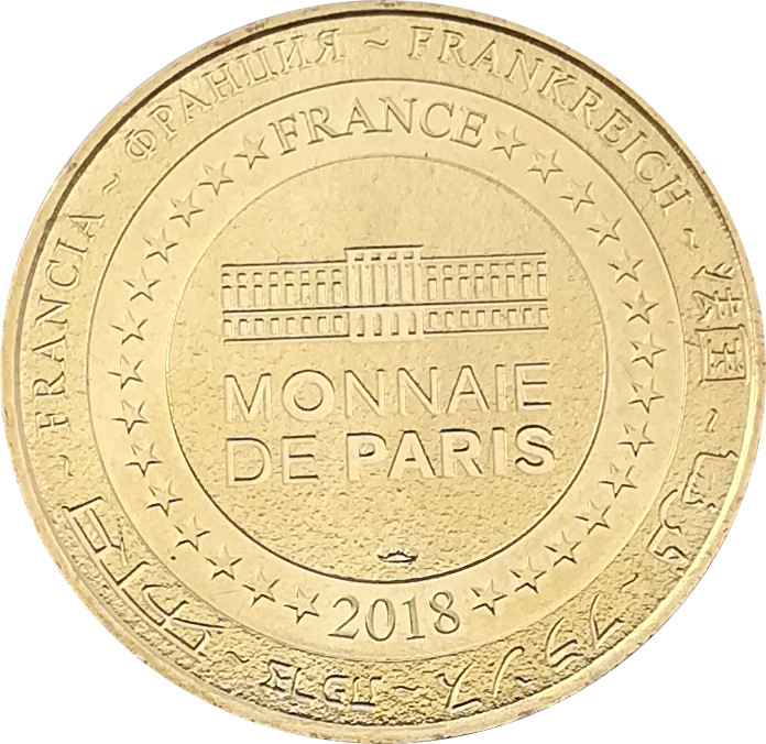 Описание: На периферії слово «Франція» написано вісьмома мовами. Франція на 12-й годині, 2018 рік на 6-й годині, все пов'язано 14 зірками праворуч і ліворуч. У центрі — будівля Монетного двору Парижа.