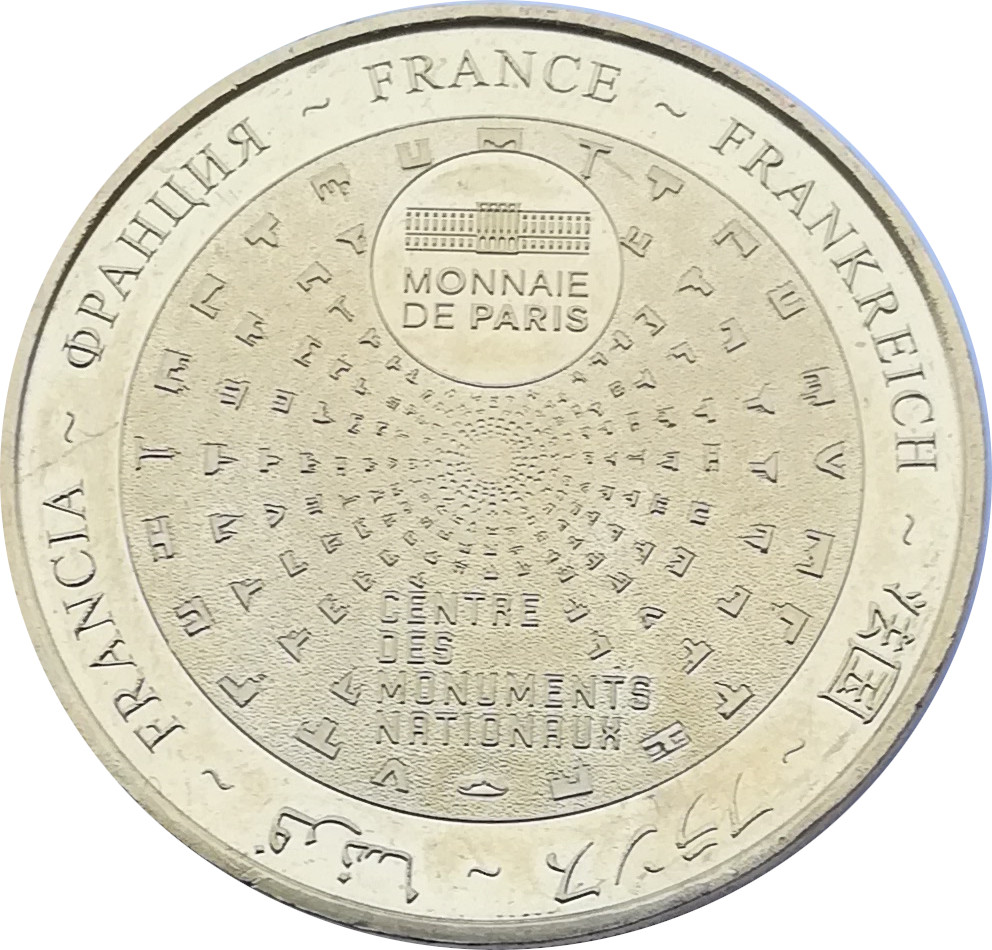Описание: На периферії слово «Франція» написано сімома мовами. У положенні «12 годин» зображено будівлю Monnaie de Paris у колі. Піктограми Centre des Monuments Nationaux сходяться в центрі.