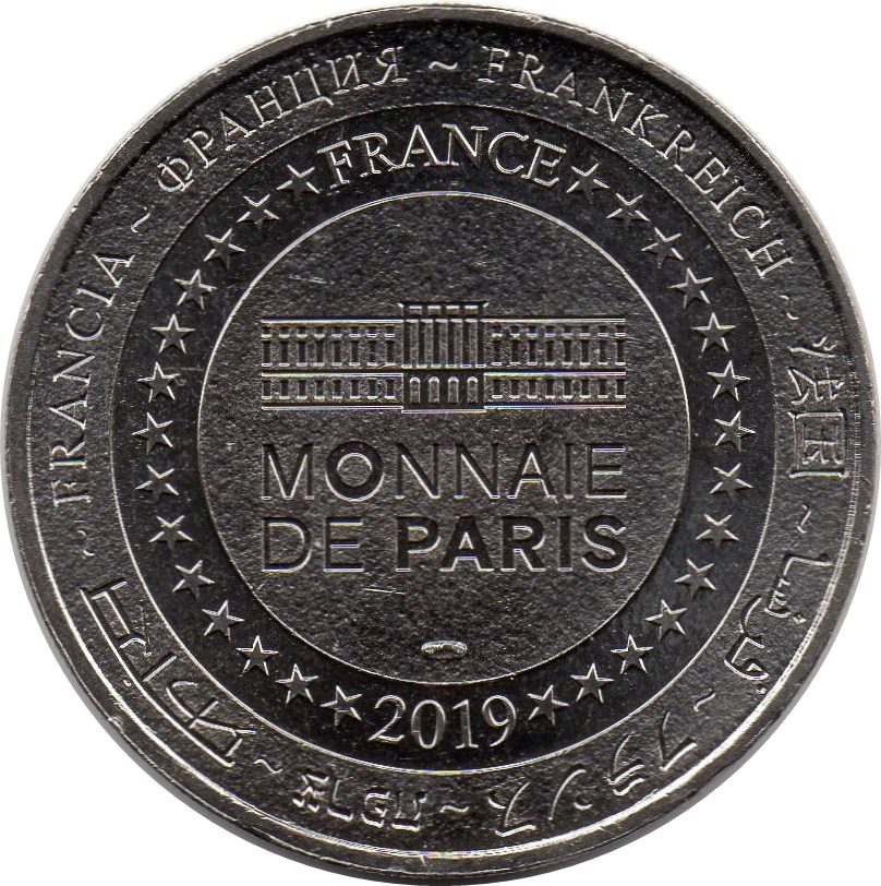 Описание: На периферії слово «Франція» написано вісьмома мовами. Франція на 12-й годині, 2019 рік на 6-й годині, все пов'язане 14 зірками праворуч і ліворуч. У центрі — будівля Моне де Парі.