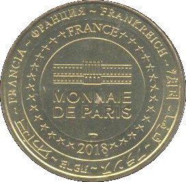 Описание: На периферії слово «Франція» написано вісьмома мовами. Франція на 12-й годині, 2018 рік на 6-й годині, все пов'язане 14 зірками праворуч і ліворуч. У центрі — будівля Моне-де-Парі.
