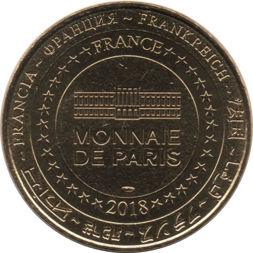 Описание: На периферії слово «Франція» написано вісьмома мовами. Франція на 12-й годині, 2018 рік на 6-й годині, все пов'язано 14 зірками праворуч і ліворуч. У центрі — будівля Монетного двору Парижа.