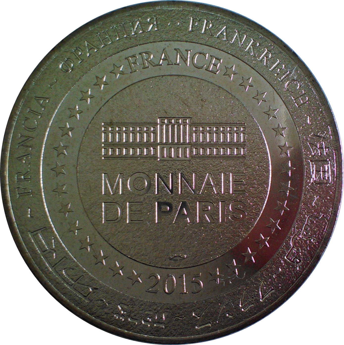 Описание: На периферії слово «Франція» написано вісьмома мовами. Франція на 12-й годині, 2014 рік на 6-й годині, все пов'язане 14 зірками праворуч і ліворуч. У центрі — будівля Монетного двору Парижа.