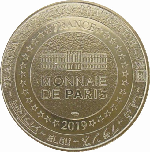 Описание: На периферії слово «Франція» написано вісьмома мовами. Франція на 12-й годині, 2019 рік на 6-й годині, все пов'язане 14 зірками праворуч і ліворуч. У центрі — будівля Монетного двору Парижа.
