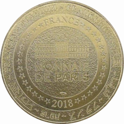 Описание: На периферії слово «Франція» написано вісьмома мовами. Франція на 12-й годині, 2018 рік на 6-й годині, все пов'язане 14 зірками праворуч і ліворуч. У центрі — будівля Моне-де-Парі.