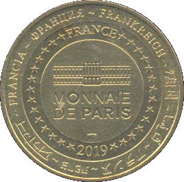 Описание: На периферії слово «Франція» написано вісьмома мовами. Франція на 12-й годині, 2019 рік на 6-й годині, все пов'язане 14 зірками праворуч і ліворуч. У центрі — будівля Монетного двору Парижа.