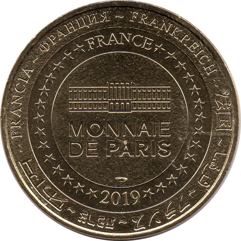 Описание: На периферії слово «Франція» написано вісьмома мовами. Франція на 12-й годині, 2019 рік на 6-й годині, все пов'язане 14 зірками праворуч і ліворуч. У центрі — будівля Моне де Парі.