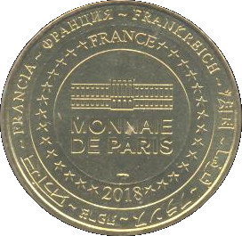 Описание: На периферії слово «Франція» написано вісьмома мовами. Франція на 12-й годині, 2018 рік на 6-й годині, все пов'язане 14 зірками праворуч і ліворуч. У центрі — будівля Моне де Парі.