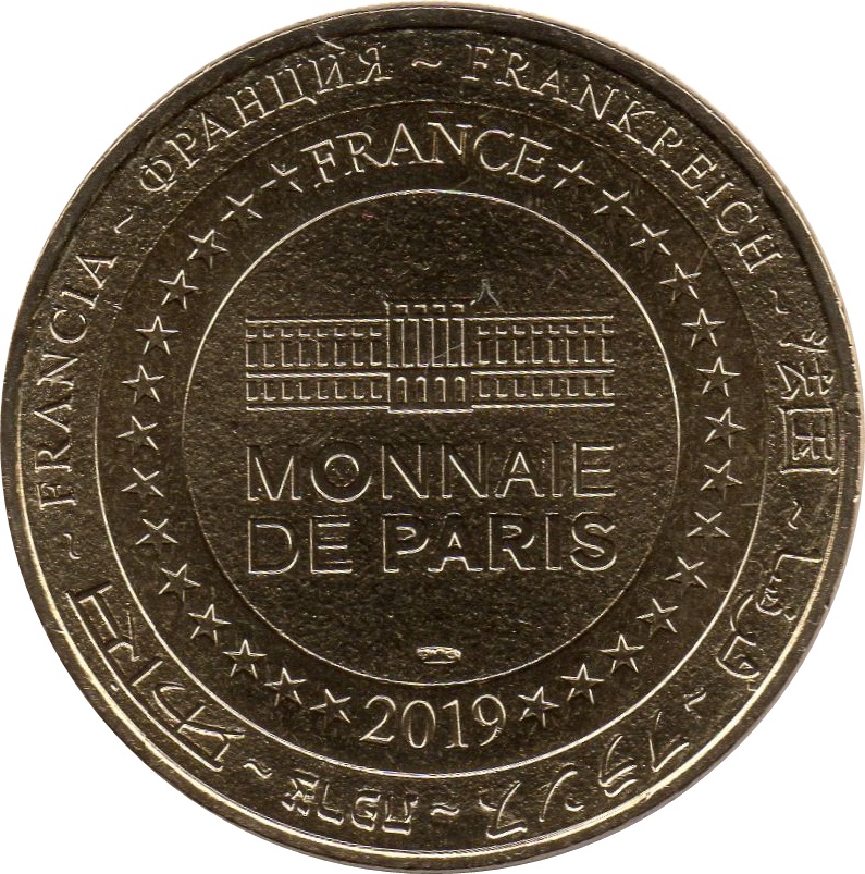 Описание: На периферії слово «Франція» написано вісьмома мовами. Франція на 12-й годині, 2019 рік на 6-й годині, все пов'язане 14 зірками праворуч і ліворуч. У центрі — будівля Моне-де-Парі.