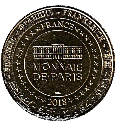 Описание: На периферії слово «Франція» написано вісьмома мовами. Франція на 12-й годині, 2018 рік на 6-й годині, все пов'язане 14 зірками праворуч і ліворуч. У центрі — будівля Моне-де-Парі.