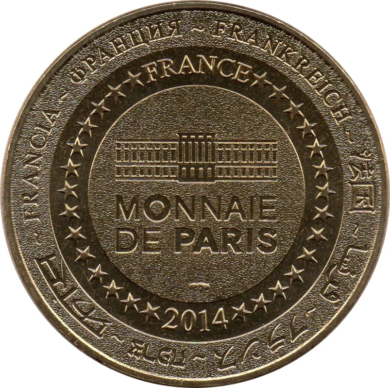 Описание: На периферії слово «Франція» написано вісьмома мовами. Франція на 12-й годині, 2014 рік на 6-й годині, все пов'язане 14 зірками праворуч і ліворуч. У центрі — будівля Моне де Парі.