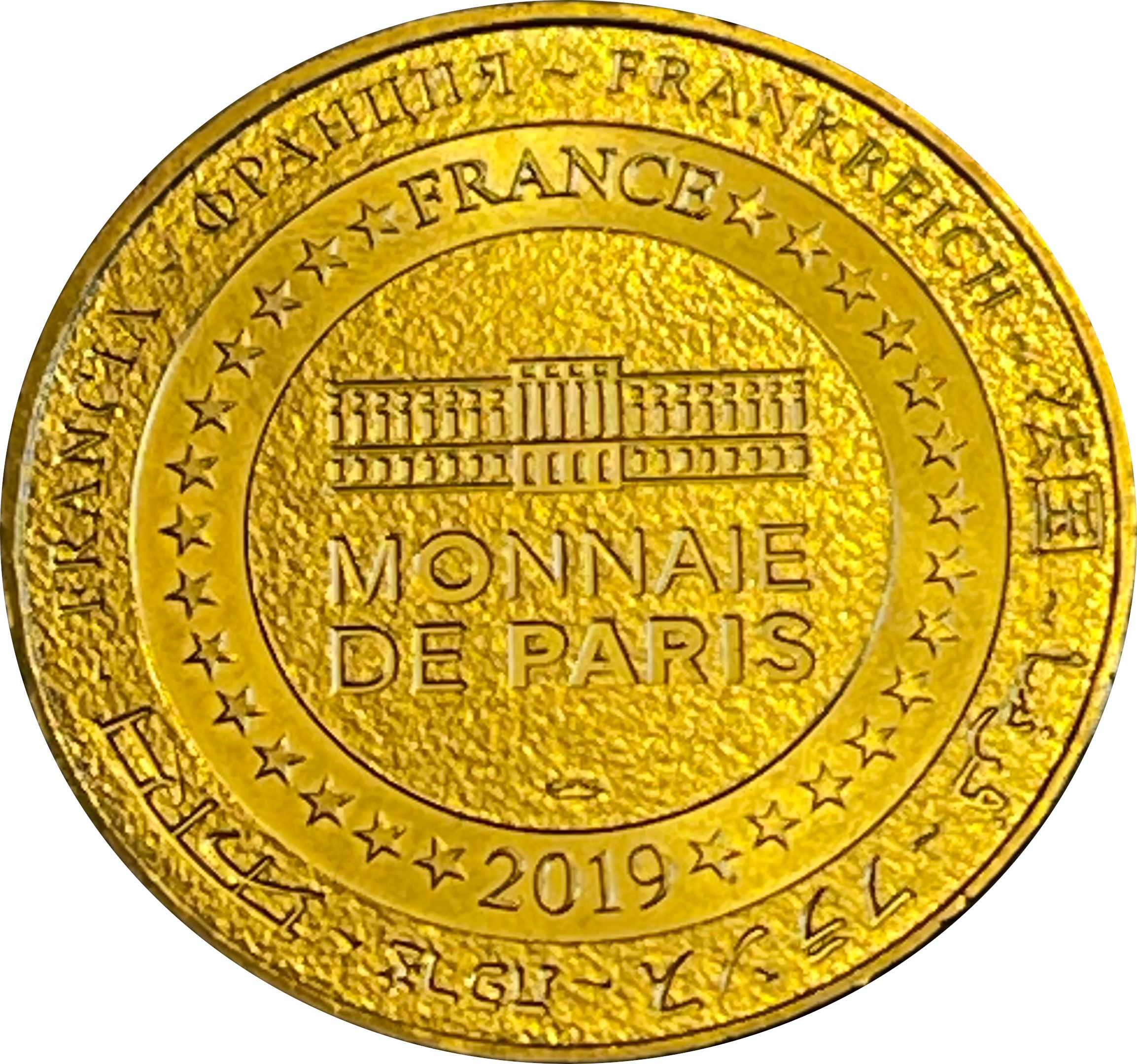 Описание: На периферії слово «Франція» написано вісьмома мовами. Франція на 12-й годині, 2019 рік на 6-й годині, все пов'язане 14 зірками праворуч і ліворуч. У центрі — будівля Монетного двору Парижа.