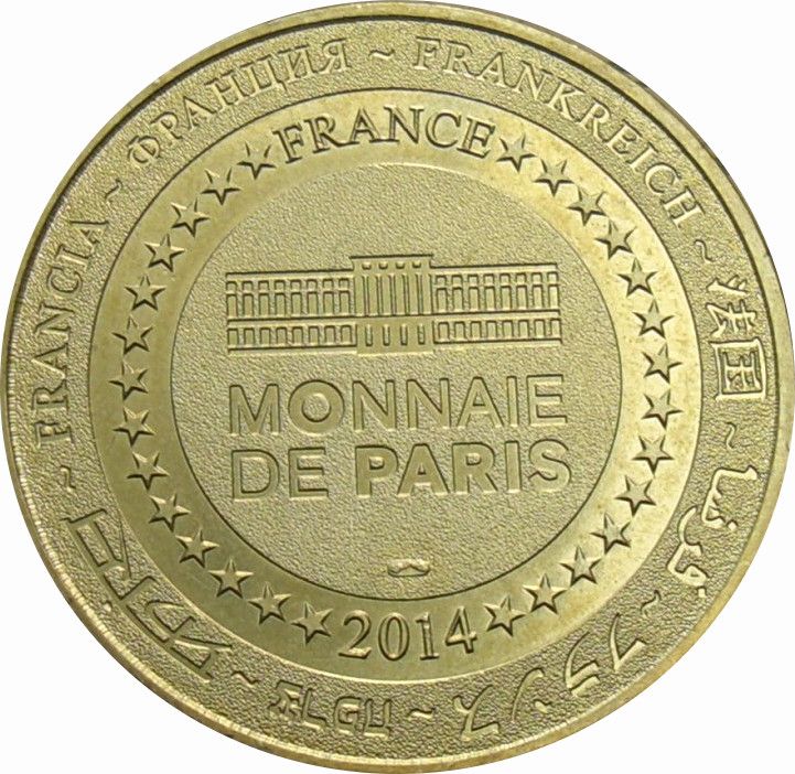 Описание: На периферії слово «Франція» написано вісьмома мовами. Франція на 12-й годині, 2014 рік на 6-й годині, все пов'язане 14 зірками праворуч і ліворуч. У центрі — будівля Моне де Парі.