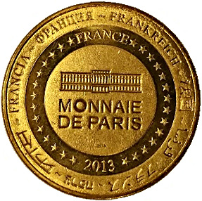 Описание: На периферії слово «Франція» написано вісьмома мовами. Франція на 12-й годині, 2013 рік на 6-й годині, все пов'язане 14 зірками праворуч і ліворуч. У центрі — будівля Монетного двору Парижа.