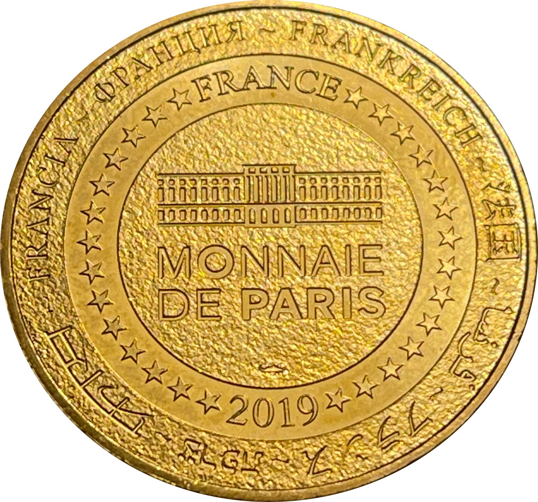 Описание: На периферії слово «Франція» написано вісьмома мовами. Франція на 12-й годині, 2019 рік на 6-й годині, все пов'язане 14 зірками праворуч і ліворуч. У центрі — будівля Моне де Парі.