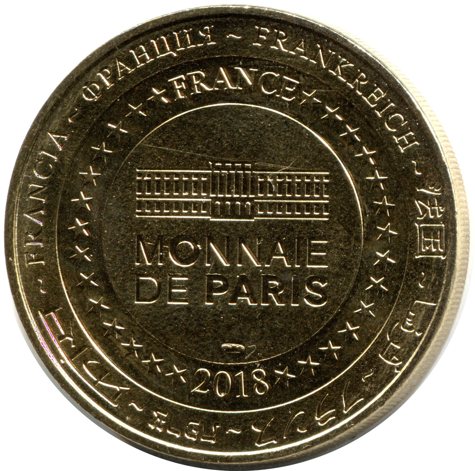 Описание: На периферії слово «Франція» написано вісьмома мовами. Франція на 12-й годині, 2018 рік на 6-й годині, все пов'язане 14 зірками праворуч і ліворуч. У центрі — будівля Моне-де-Парі.