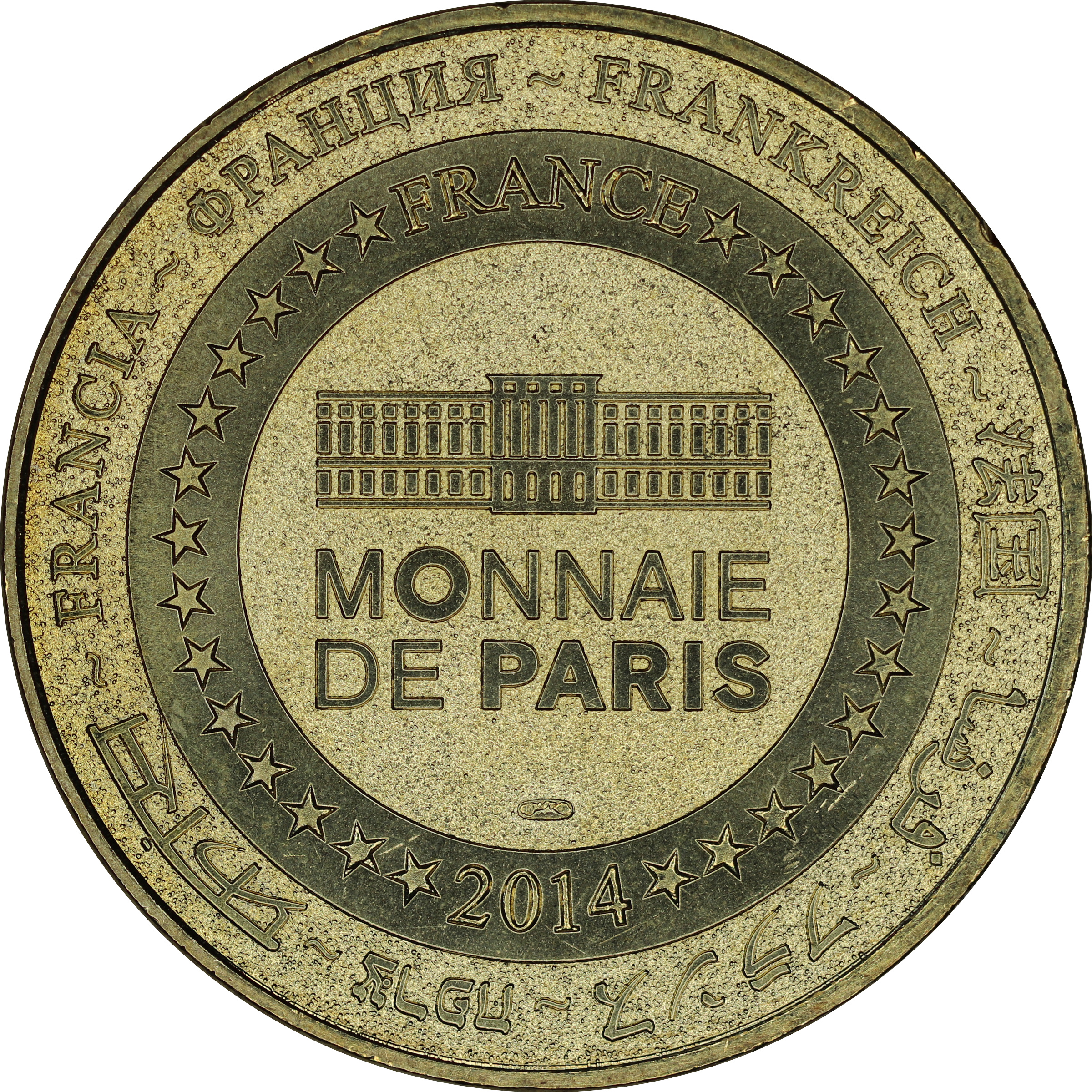 Описание: На периферії слово «Франція» написано вісьмома мовами. Франція на 12-й годині, 2014 рік на 6-й годині, все пов'язане 14 зірками праворуч і ліворуч. У центрі — будівля Монетного двору Парижа.