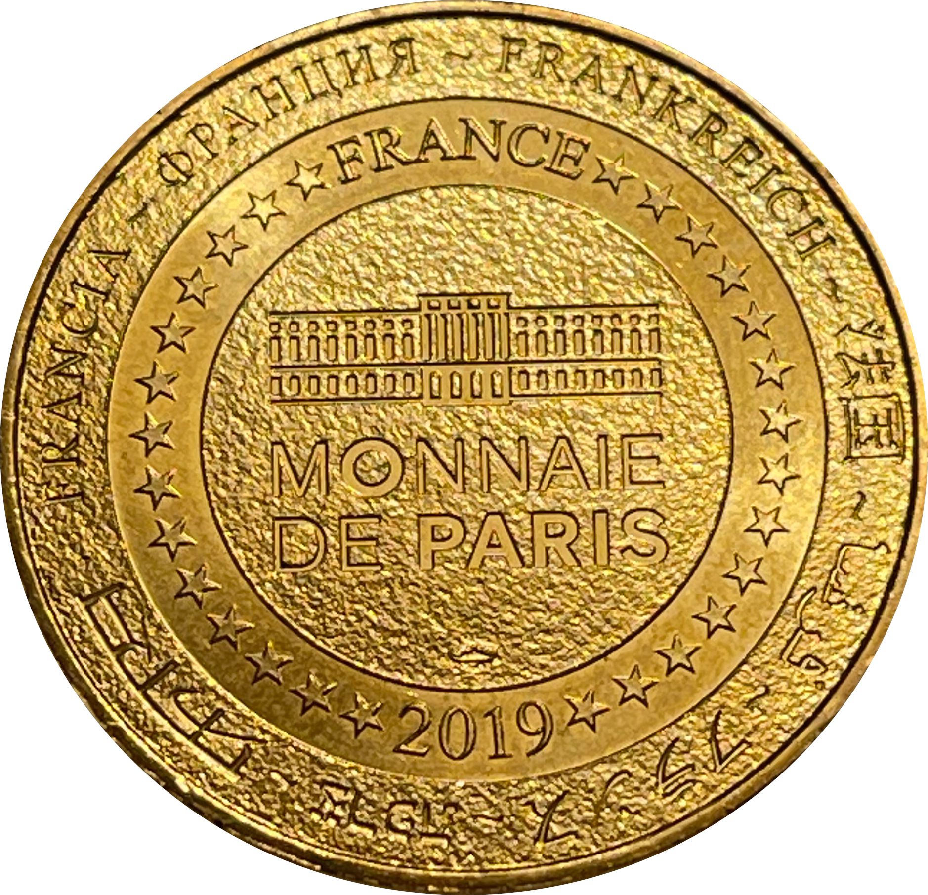 Описание: На периферії слово «Франція» написано вісьмома мовами. Франція на 12-й годині, 2019 рік на 6-й годині, все пов'язане 14 зірками праворуч і ліворуч. У центрі — будівля Моне де Парі.