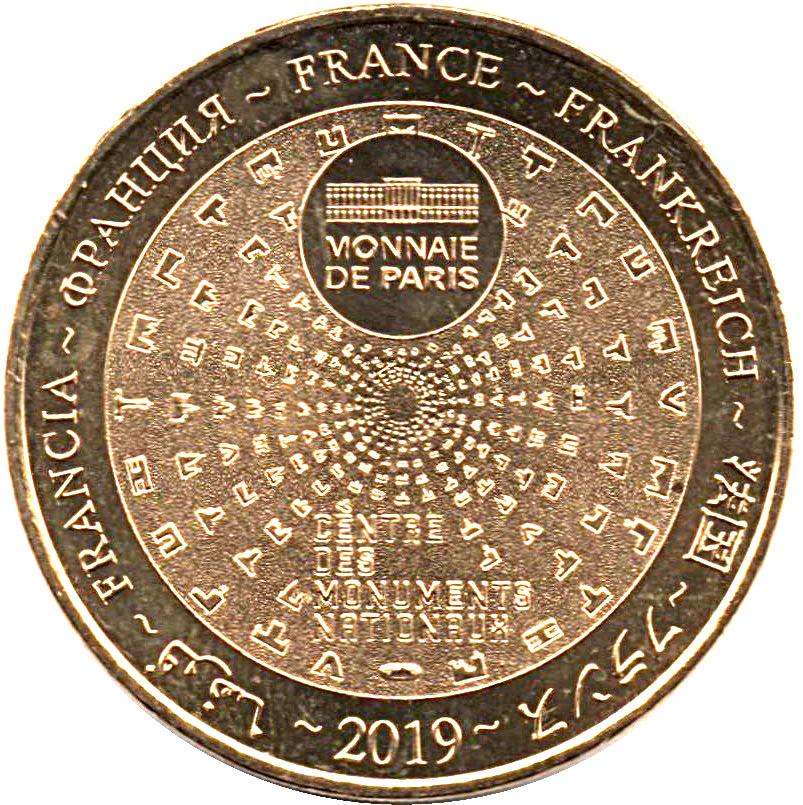 Описание: На периферії слово «Франція» написано сімома мовами. У положенні «12 годин» зображено будівлю Monnaie de Paris у колі. Піктограми Centre des Monuments Nationaux сходяться в центрі.
