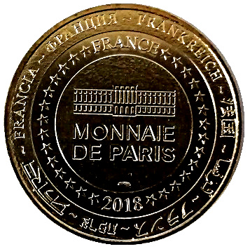 Описание: На периферії слово «Франція» написано вісьмома мовами. Франція на 12-й годині, 2018 рік на 6-й годині, все пов'язане 14 зірками праворуч і ліворуч. У центрі — будівля Моне де Парі.