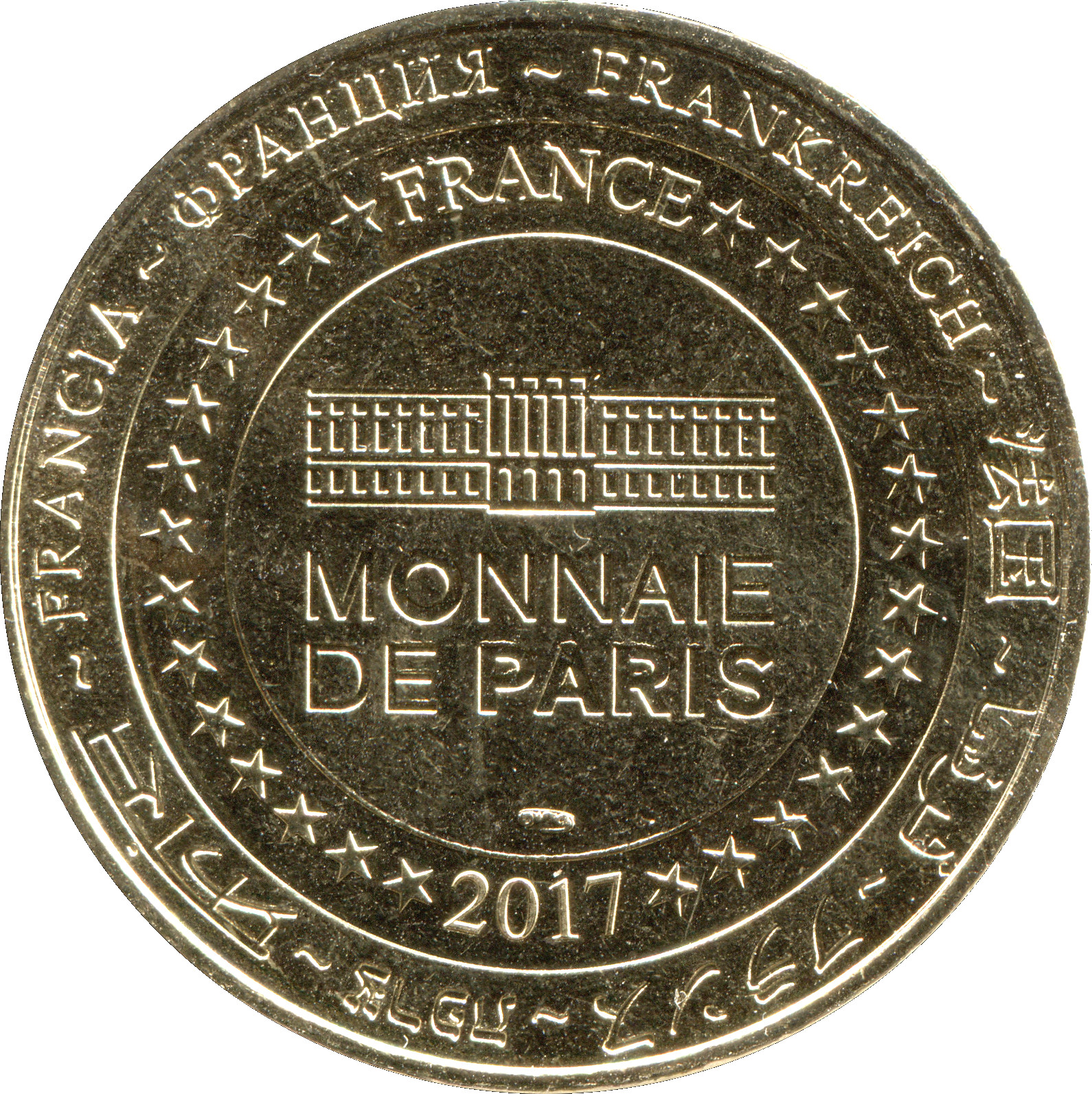 Описание: На периферії слово «Франція» написано вісьмома мовами. Франція на 12-й годині, 2017 рік на 6-й годині, все пов'язане 14 зірками праворуч і ліворуч. У центрі — будівля Monnaie de Paris.